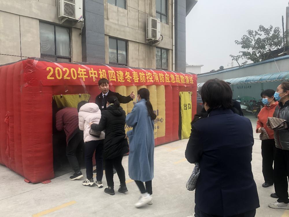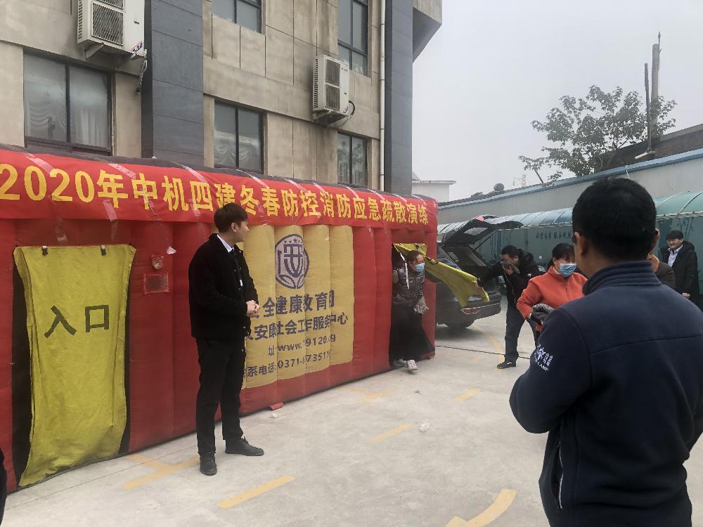 演练在公司办公楼西南角空地处开展,一顶充气式消防模拟演练帐篷已经提前立在了空地上。该帐篷设有一个进口与一个出口,进出口上带有遮光门帘,内部用充气的“隔断墙”,把帐篷内分隔成迂回曲折的走道空间,并隐藏有一个小小的迷宫,通过在空间内释放无害刺鼻的烟雾,营造出浓烟弥漫的“模拟火场”效果。