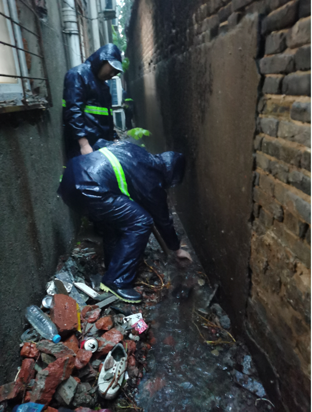 当天下午,由于雨势过大、招待所楼后地势较低,出现了严重的积水和渗水,工会物业部门迅速调派维修班成员赶往内涝区域分段疏通房后障碍物。
