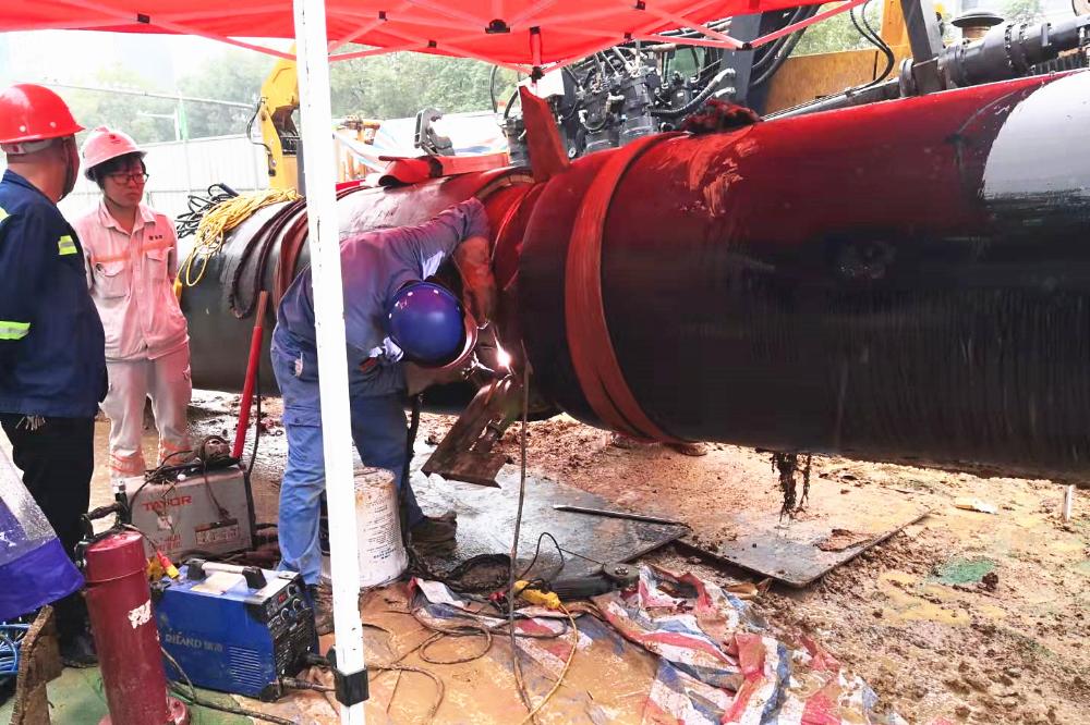 根据原设计方案,热力管道需向南侧转角平移并穿过西杨村河,是施工中的难点,受到现场西杨村河临边高压线塔、变压器箱、小区主通道等情况及相关部门制约影响,无法按照设计方案执行施工方案。结合现场实际地质及地下管线情况,拟采用定向钻施工工艺穿越西杨村河位置。本次定向钻单根长度600米,管道直径DN800,钢管穿越长度600米*2,由于预制场地狭窄,穿越管分为两段,先穿越300米,再将剩余300米对口焊接、探伤、保温完成并检验合格后穿越另外300米,历时近18个小时最终完成了单根600米管道的穿越。