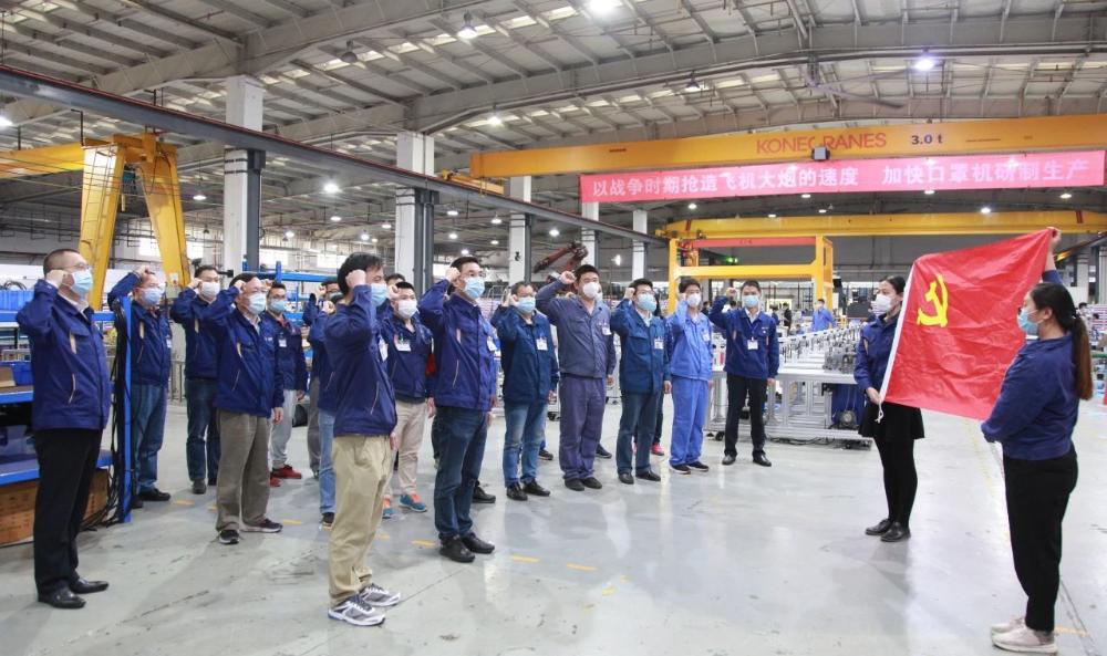 口罩机事业部临时党支部紧急动员150多名员工第一时间复工,临时租用1000多平方米的机器人生产厂房,开启了80%员工吃住在厂,执行人员设备24小时轮班作战的工作模式,“以战争时期抢造飞机大炮的速度”加快口罩机的研制生产;2月16日,研制调试进入攻坚阶段,25名党员组建临时党支部、12名团员成立青年突击队冲锋在前、英勇奋战在口罩机研制生产第一线;项目负责人带领技术研发组“逆行”至多家口罩机生产厂家,星夜兼程赶制加工部件图纸,3日内完成530多张加工部件图纸的优化设计和创新发明……最终实现10天研制首台套平面口罩机并完成压力测试!20天生产100台套!30天生产200台套!为缓解口罩供应紧缺,解决“一罩难求”作出贡献。