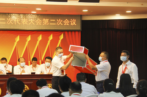 庄严的报告厅气氛热烈,主席台上方悬挂着“中国共产党中国机械工业建设集团有限公司第二次代表大会第二次会议”的会标,背景正中镰刀和锤头组成的党徽熠熠生辉,10面红旗分列两侧鲜艳似火。报告厅后面悬挂着“高举习近平新时代中国特色社会主义思想伟大旗帜 勠力推进中机建设高质量发展”的横幅。